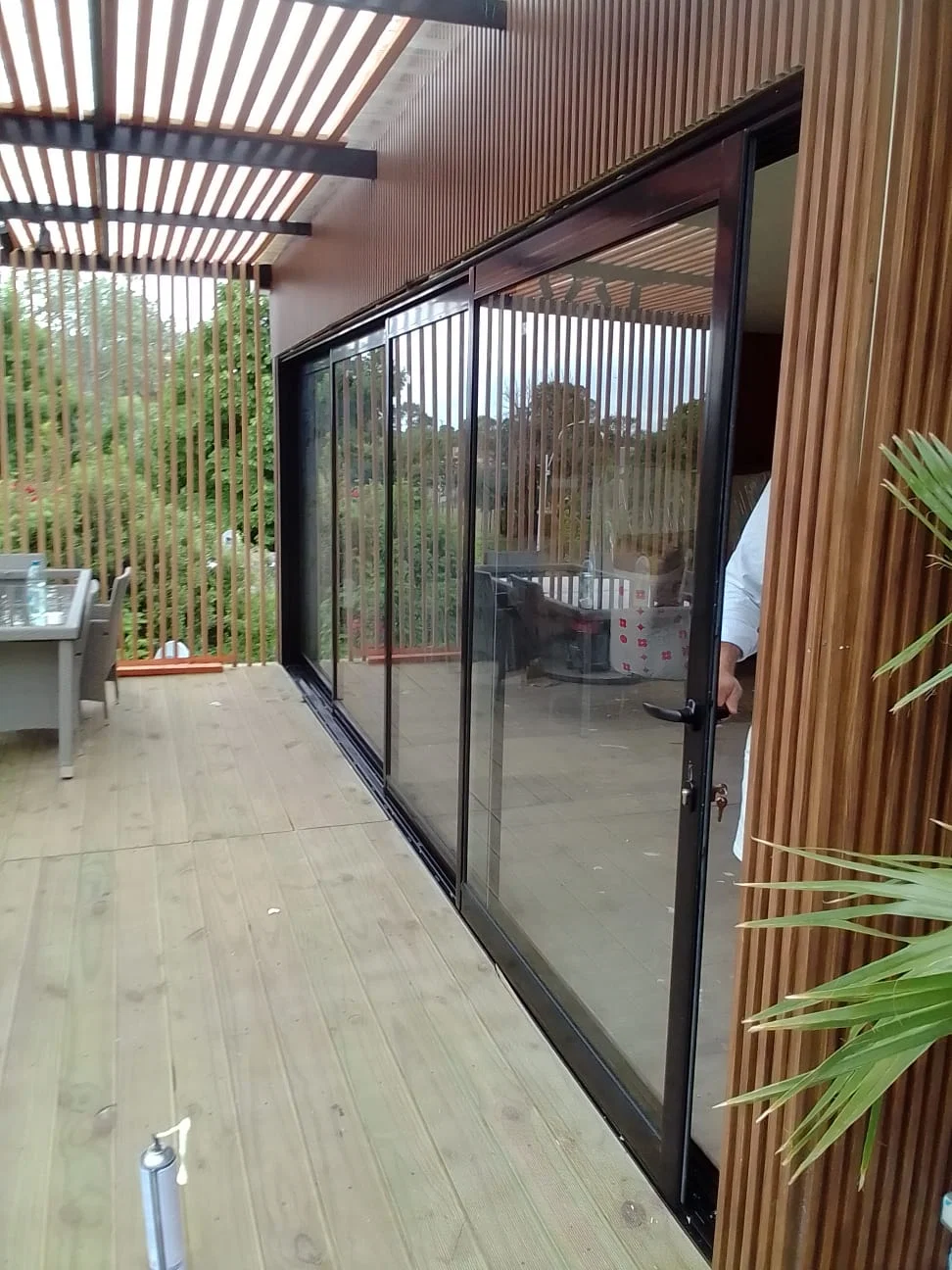 Este proyecto residencial destaca por su diseño arquitectónico moderno que integra perfectamente las aberturas de aluminio con elementos naturales como la madera. Las ventanas corredizas panorámicas de gran formato crean una continuidad visual entre los espacios interiores y el área de jardín. Los perfiles de aluminio de línea recta, fabricados con materiales de Aluminios del Uruguay, aportan robustez y durabilidad, mientras que el vidrio doble hermético garantiza eficiencia térmica y acústica. La integración con la pérgola de madera demuestra la versatilidad de nuestras soluciones para adaptarse a diferentes estilos arquitectónicos.